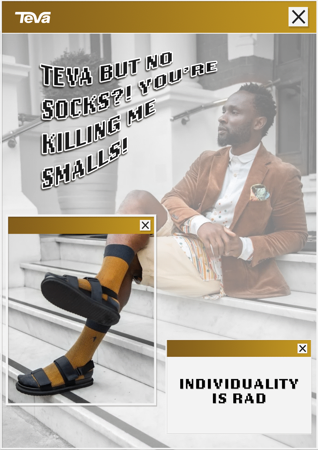 To encourage people to be fashionable with sandals, one of the ideas we came up with is to create a new section on their website where people can mix and match Teva sandals with socks. Another area of our campaign are ads for bus stations in 90s web aesthetic with editorial shots of people rocking their sandals fashion. We chose to really lean in on the 90s nostalgia for our art direction as Teva boomed in the 90s. Lastly, our radio ad plays on the idea of 'what if socks and sandals are now the cool thing and has been normalized in the future?'